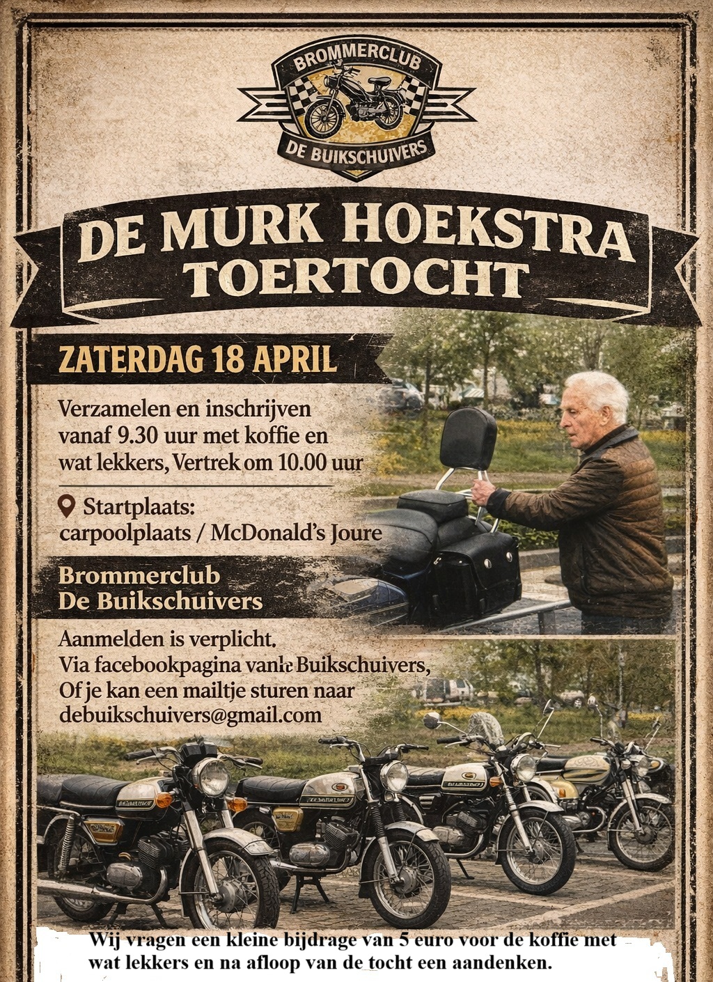 Tegenwoordig kun je op de social media wel zoeken naar brommerclubs en organisaties die een rit organiseren maar je vindt ze nooit allemaal en aan de andere kant zal (zeker onder de oudere deelnemers) niet iedereen een Facebook of Instagram account hebben.