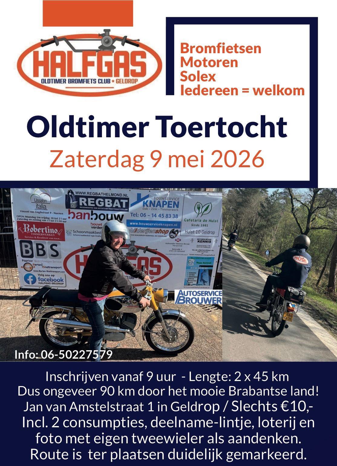 Slechts €10,- incl. 2 consumpties, geprinte foto met uw bromfiets, deelname lintje en loterij met leuke prijzen. Informatie via: 06-50227579 Met vriendelijke groet, HALFGAS Geldrop