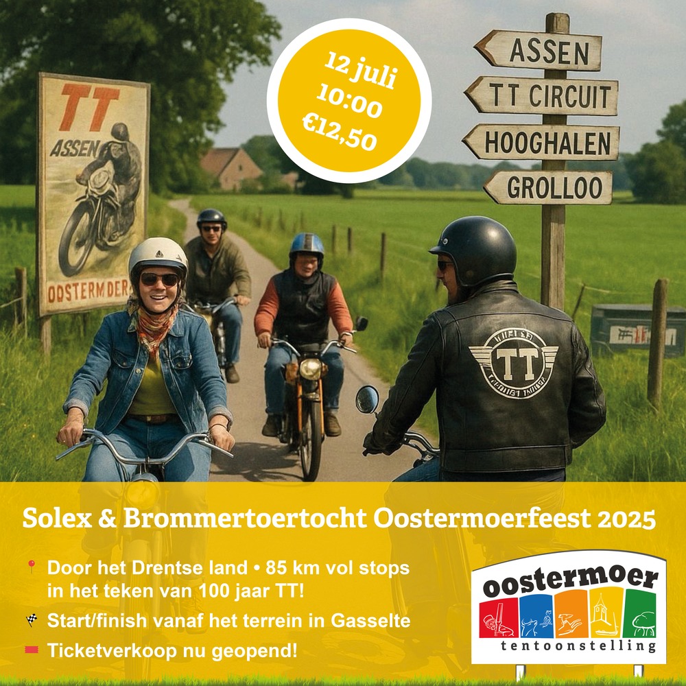 Zin in een nostalgische rit door het prachtige Drentse land? Stap op je solex of brommer en doe mee aan de Solex & Brommertoertocht tijdens het Oostermoerfeest 2025! 🚴♂️🏍️