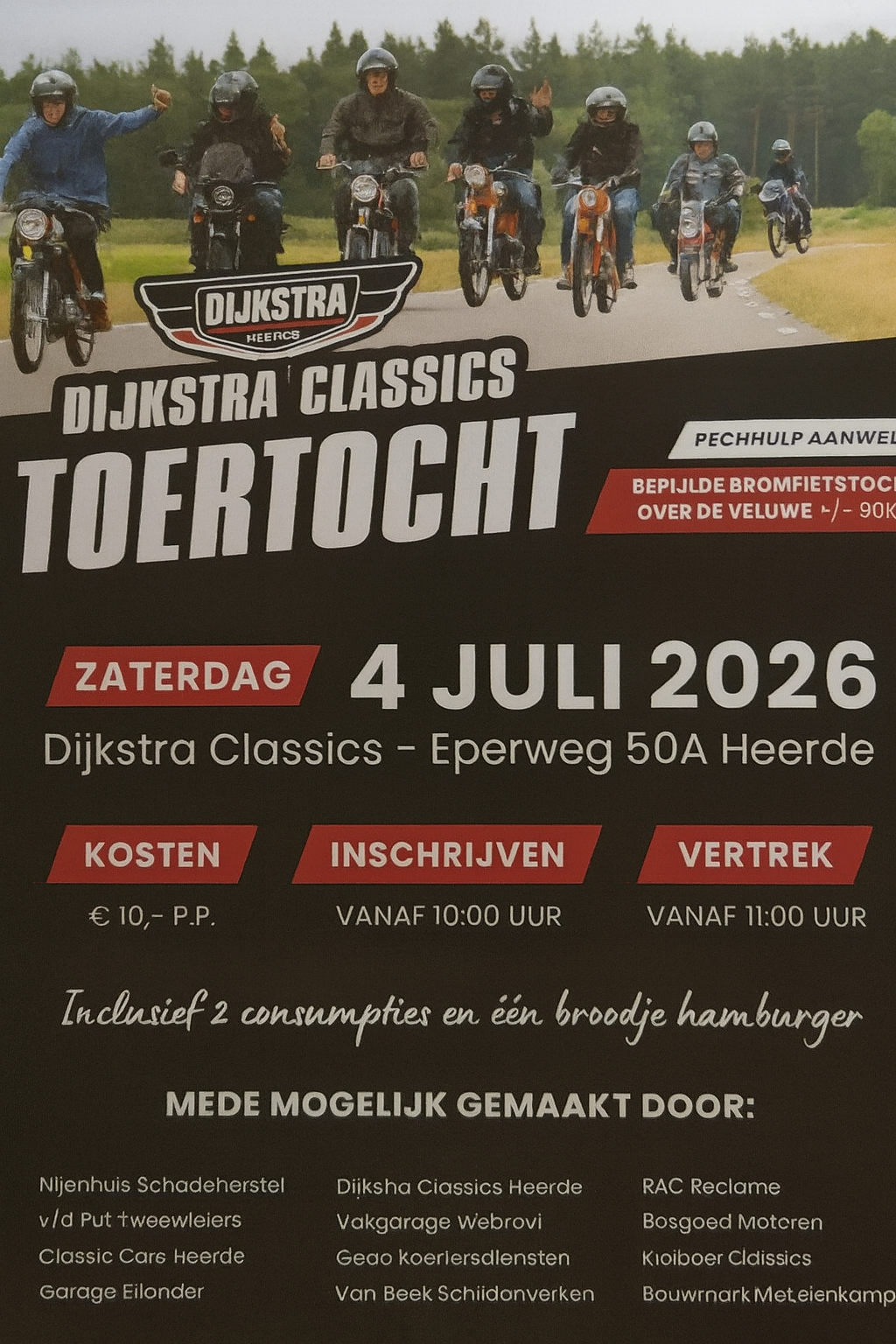 • 10:00 – 11:00 Start rondrit voor de bromfietsen.